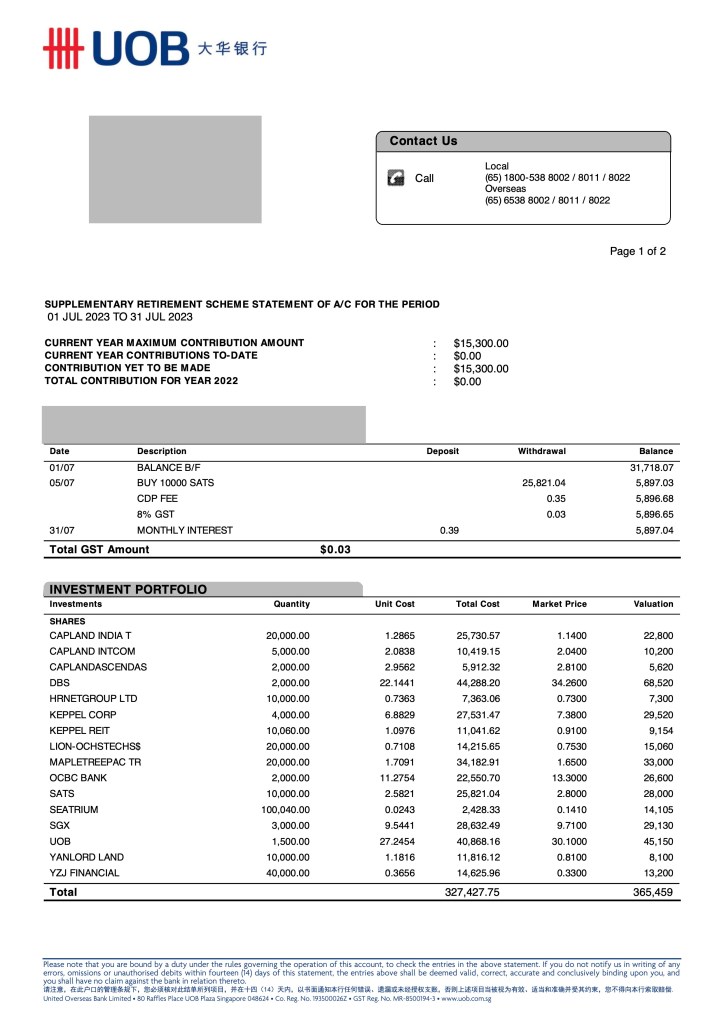Well I have to count my blessing as I finally got the REITs sector to under 20% of the SRS Fund post July. I have completely dispose CICT at a reasonable price before its result announcement. Bad news continues to flow in the sector as previously highlighted cause of higher interest rate eating into DPU narrative continues to play out. I am horrified by some REITs manager to even consider any acquisitions at this moment in time.