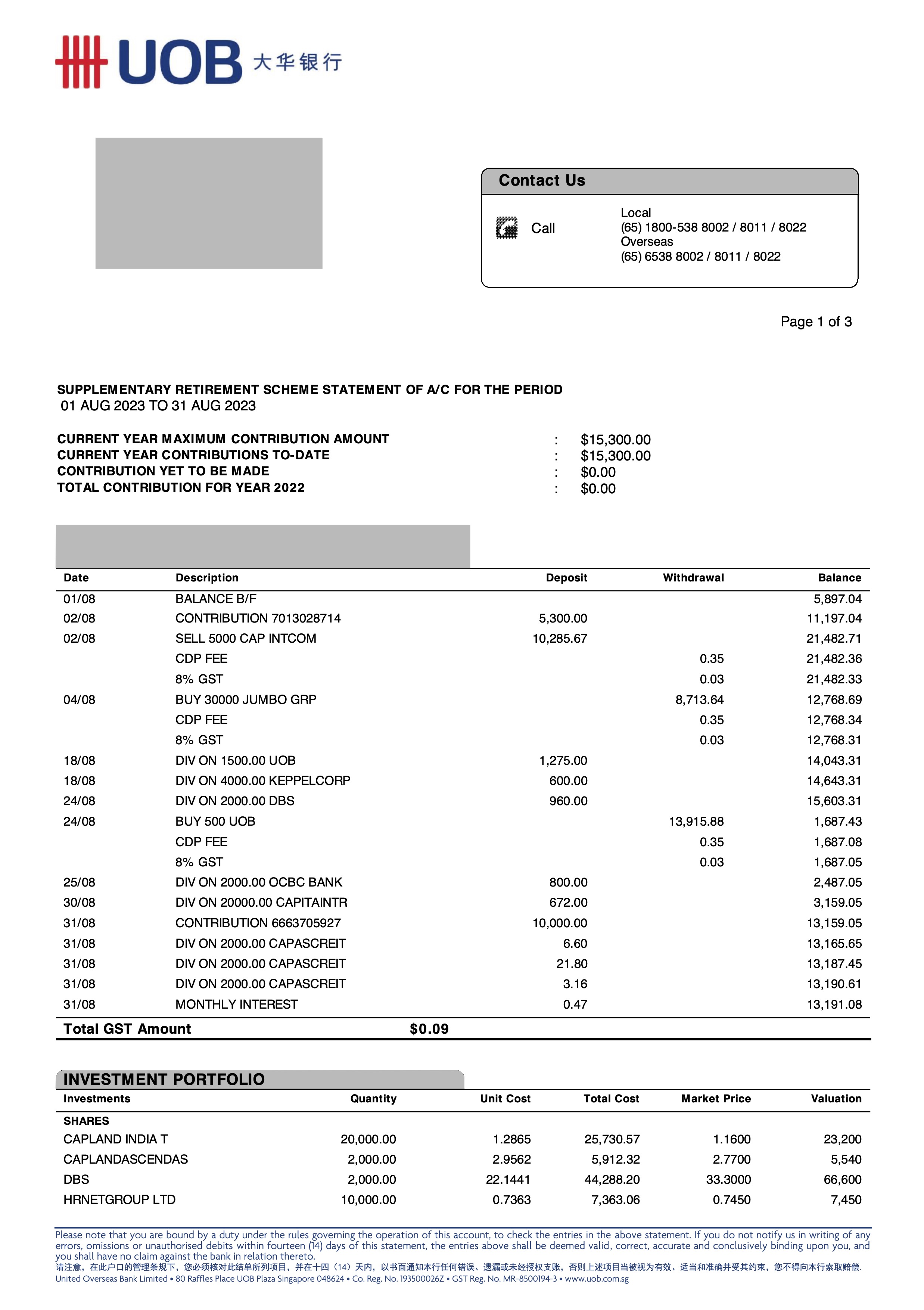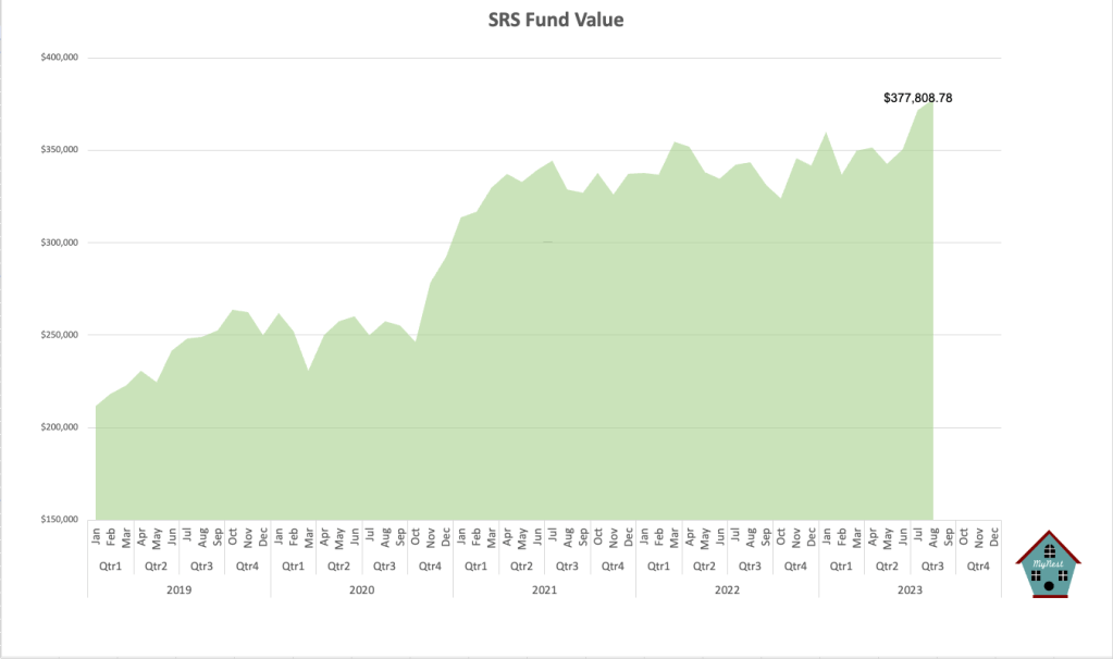 The SRS Fund grew to $377,808.78 with the new contributions to SRS of $15,300. In Aug the market took a breath from its July high and businesses were generally priced lowered. I expect the fund value to remain at current levels to the end of the year as continue strong earnings from local banks will hold up the portfolio.