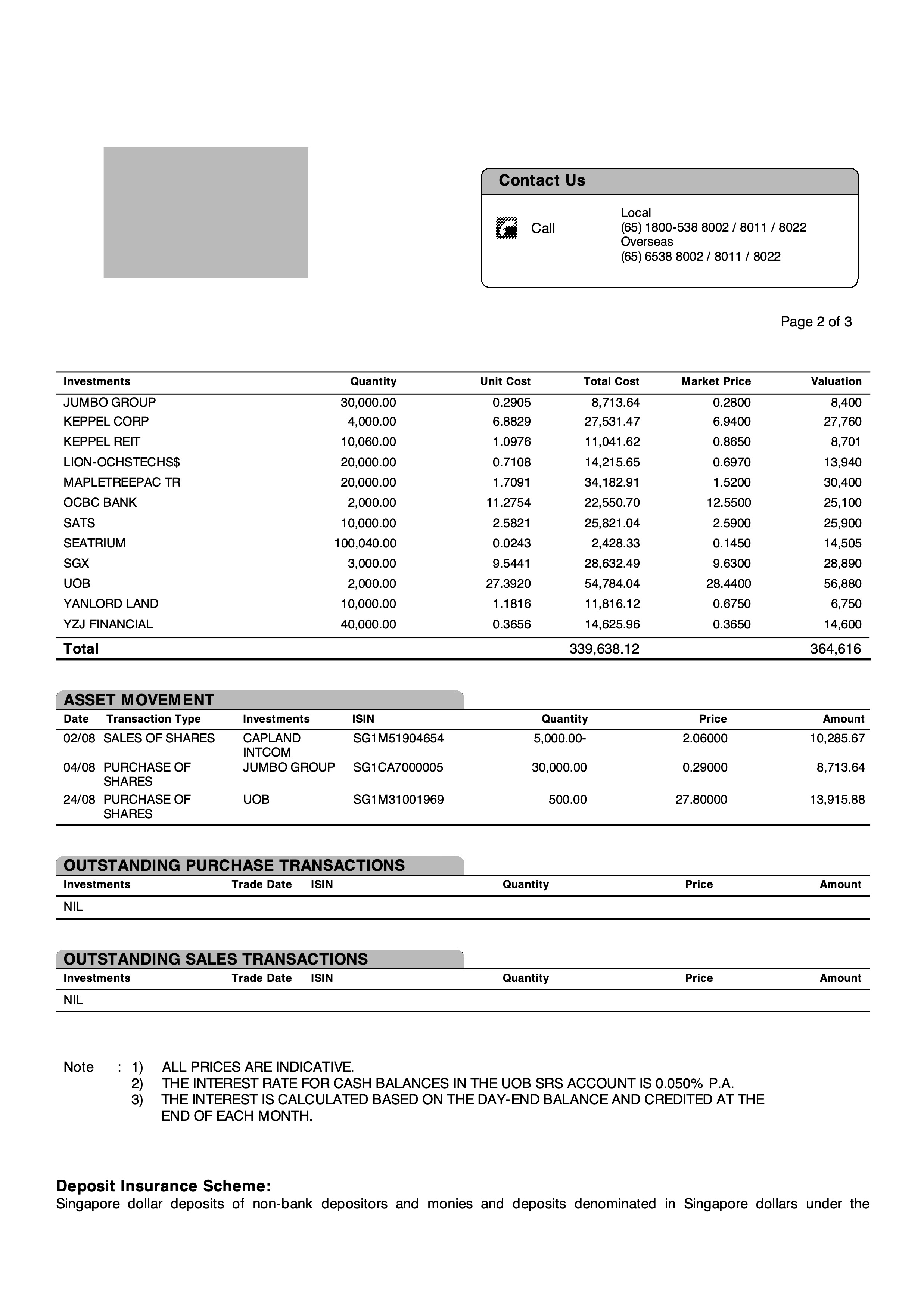 Another REIT was dispose during the month as I took advantage by selling CICT to Mr Market @ $2.06. I subsequently use the proceeds plus new funds to acquire more of UOB @ $27.80 and first foray into Jumbo @ $0.29 a food & beverage business. There was also some month end purchase of Venture Corp @ $12.68 which was not reflected in this month statement.