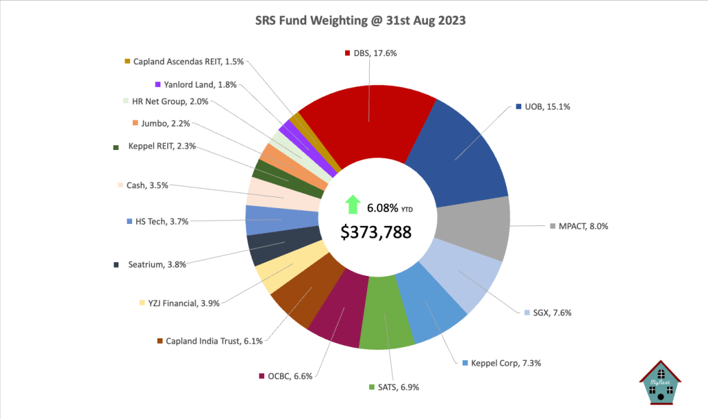 As the full amount of $15,300 was contributed in the month of Aug, I have took this into consideration in the calculation of year to date %. Assuming the contribution did not take place, the SRS Fund is up 6.08% for the year. This result outperformed the STI by 6.6% by end Aug.