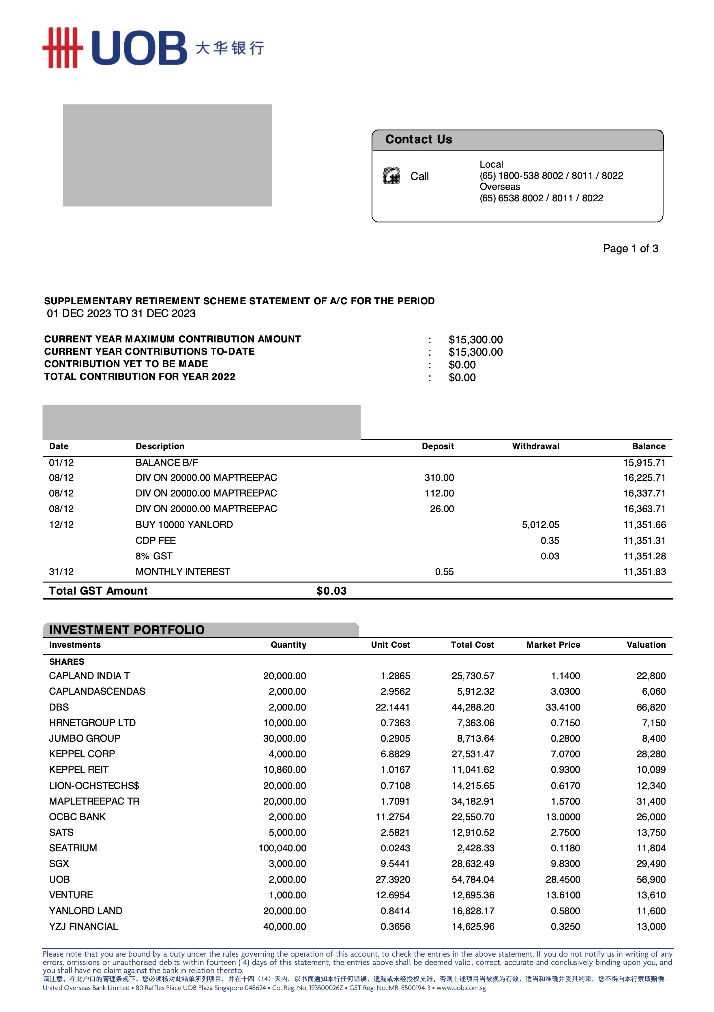 The cash level remains low at 3% as I was able to find an opportunity to deploy some cash into Yanlord Land in Dec. Going forward incoming dividend should increase this cash holding level now that I have decided to contribute to SRS Fund only at the end of the year.