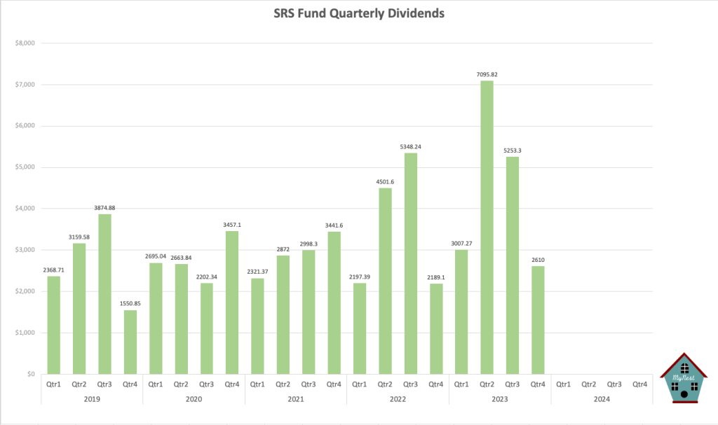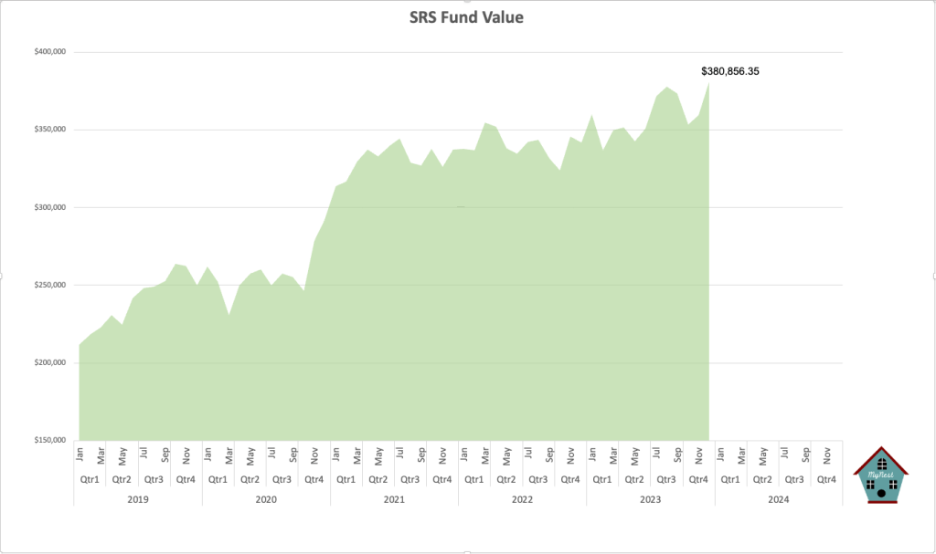 Dividend for the first time in the SRS Fund’s history exceeded the maximum contribution amount of $15,300. This is a monumental moment as this signifies that the passive income of the Fund is now contributing more than its active or earned contribution. The total dividend received for 2023 is $17,966.39.