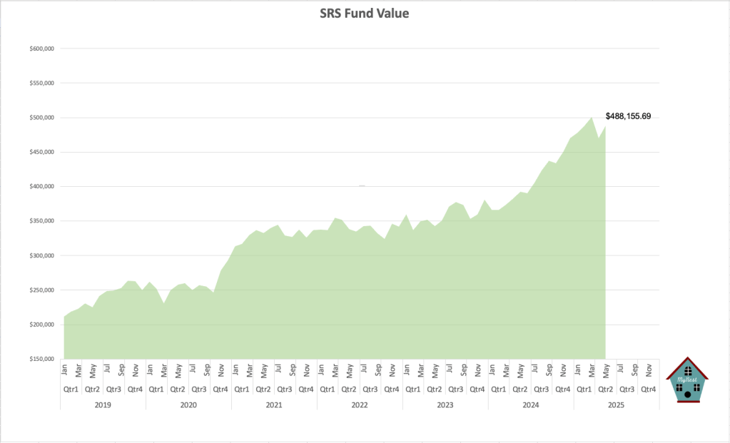 After a down month, the SRS Fund Value returns to its upward trajectory, hovering just below the half-million mark. Assuming there is no major setback to the global economy, I expect the $500k milestone to be exceeded again by end of the year.