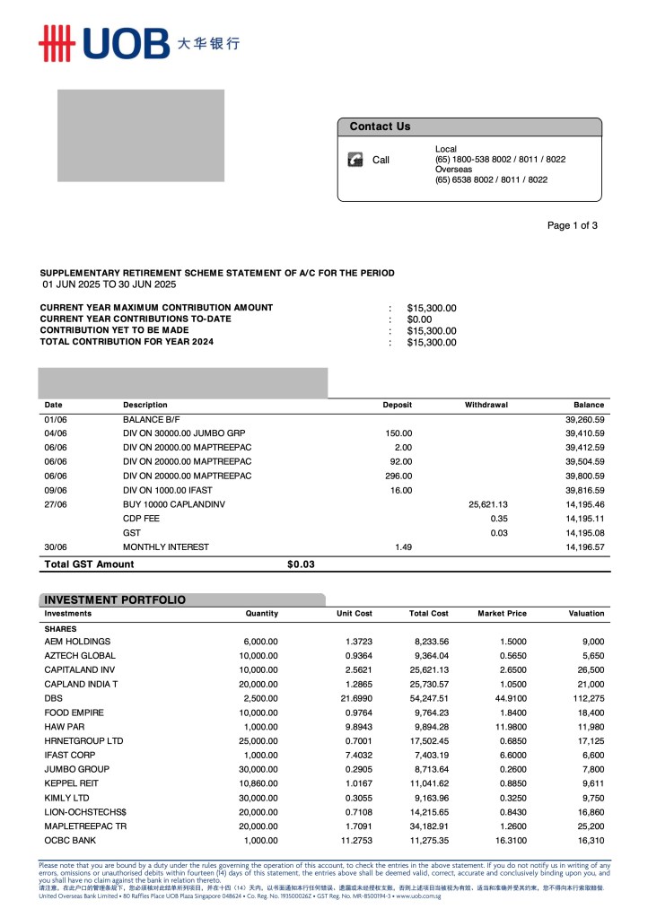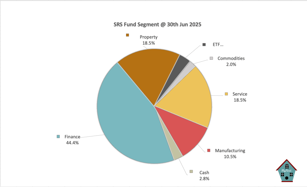 The property segment grew to 18.5% with our investment in Capitaland Invest. Otherwise, the SRS Fund is still heavy in the finance sector with the 3 local banks making a bit less than half of the fund.