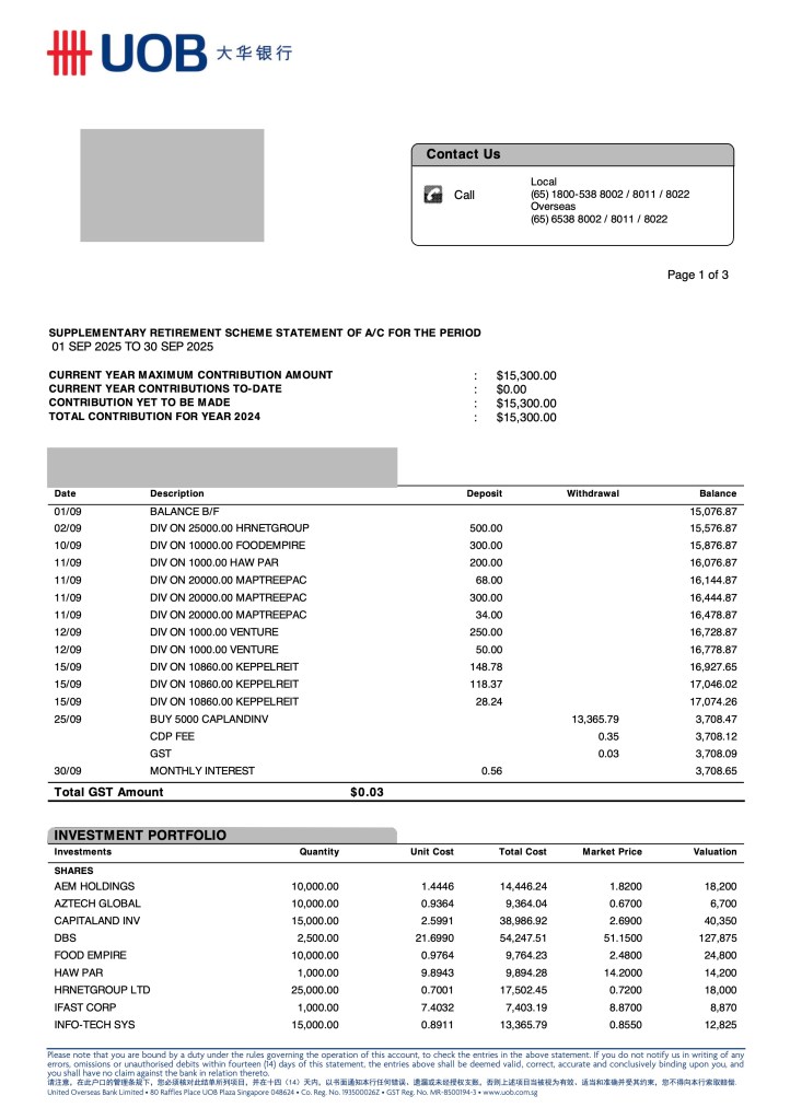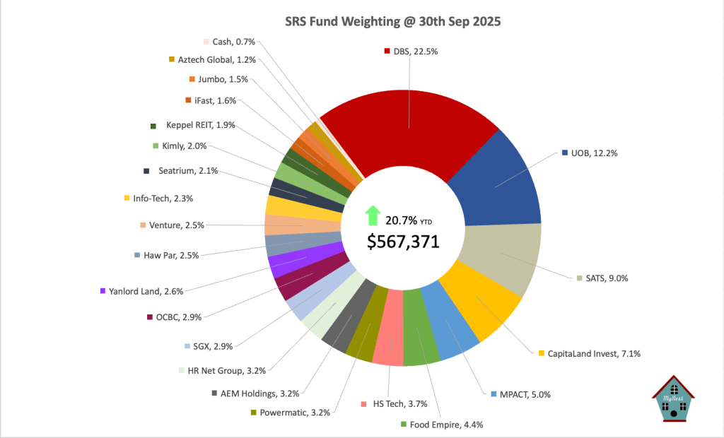 Total SRS Fund value hit another record high at $567,371.99. This is up 20.7% for the year versus the STI 13.5%.
