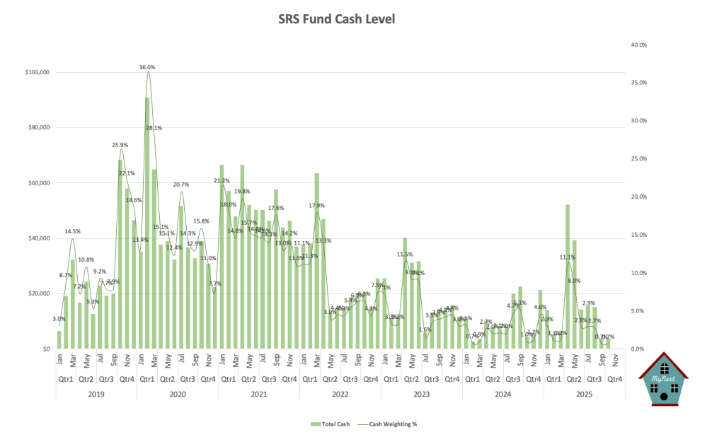 Cash level remains at a record low of 0.7% as the SRS Fund takes full advantage of having time in the market.