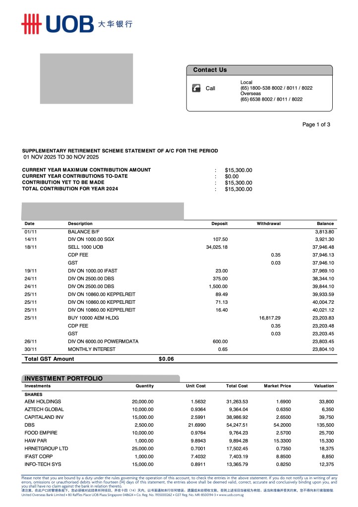 The trimming of UOB was a necessary rotation as I aim to keep the SRS Fund’s capital working efficiently. By halving the UOB position and rotating into AEM, I have swapped a slower-moving bank allocation for a recovery tech play with a strong AI tailwind.