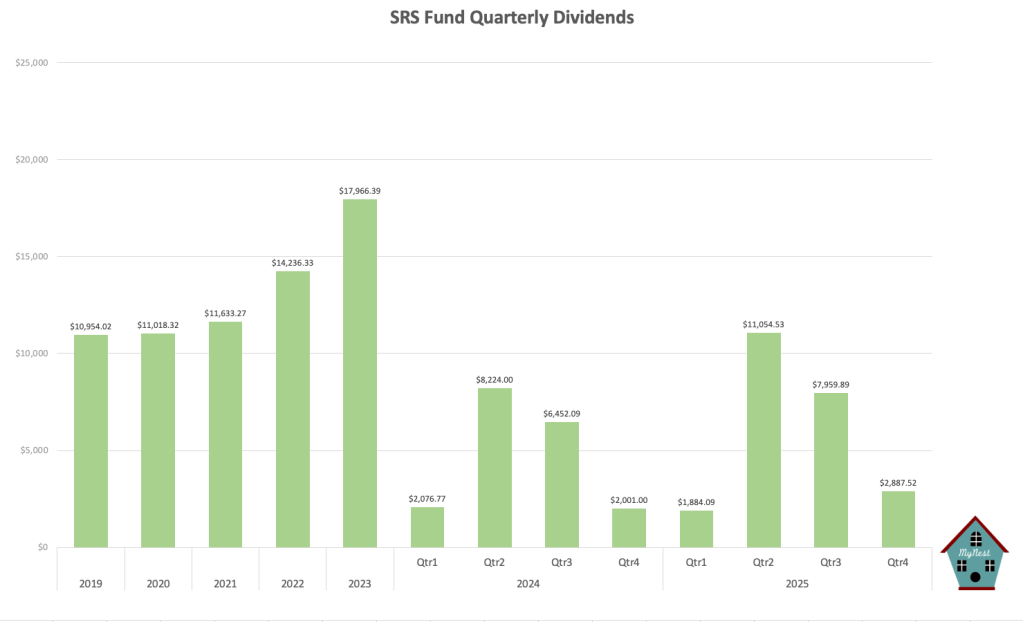 Q4 is off to a quiter start on the dividend front with $2,887.52 worth of collection compared to the massive Q2 & Q3 payout saw earlier in the year. This seasonality is expected, but the steady flow of income continues to anchor total return.